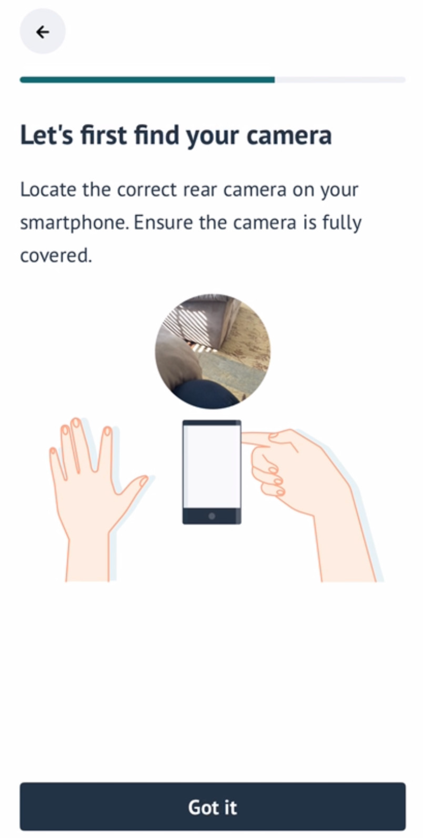 When you reached the ‘Find your camera’ screen, you’ll see a circle showing the camera’s view. Test each camera lens by gently covering it.